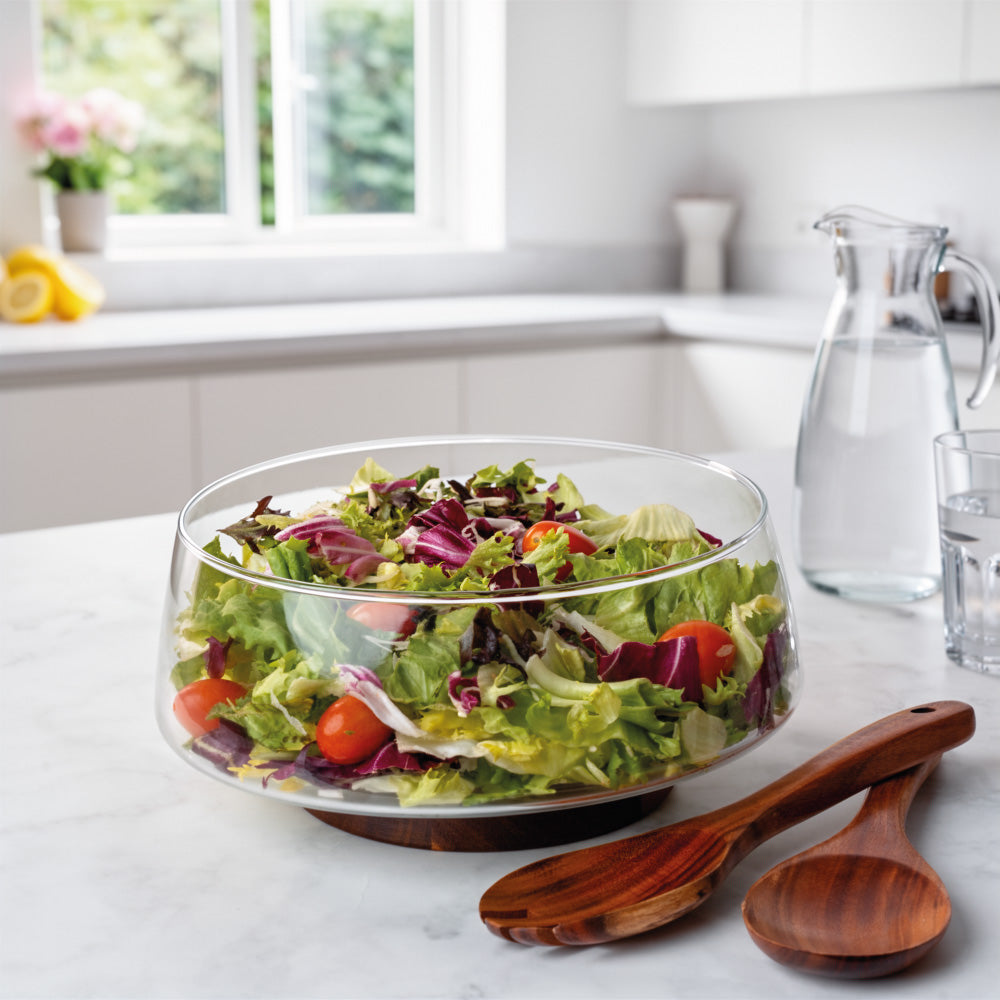 Salatschüssel aus Glas mit Salatbesteck und Untersetzer