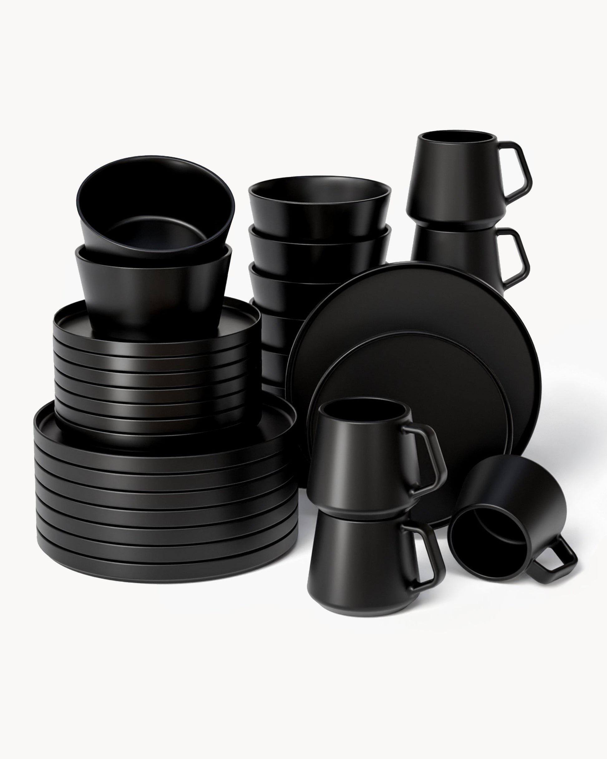 Das 32-teilige Luxe Geschirrset besteht aus 8 Vorspeisentellern (Ø 20 cm), 8 großen Speisetellern (Ø 26 cm), 8 Schüsseln (740 ml) und 8 Kaffeetassen (420 ml). Mit seiner klaren Form, der matten Oberfläche und den neutralen Farben in Schwarz und Cremeweiß bringt das Set moderne Eleganz auf jeden Tisch. Die erhöhte Kante der Teller sorgt für eine besondere Optik und setzt Speisen stilvoll in Szene. Das Geschirr überzeugt nicht nur durch Design, sondern auch durch Funktionalität: Die Schüsseln und Teller sind platzsparend stapelbar und damit perfekt für den Alltag. Die konisch geformten Tassen runden das Design ab und halten dank der schmalen Öffnung Heißgetränke länger warm. Gefertigt aus hochwertiger Keramik in Restaurantqualität, ist das Set robust, mikrowellengeeignet und spülmaschinenfest – ideal für alle, die stilvolles und zuverlässiges Geschirr suchen.