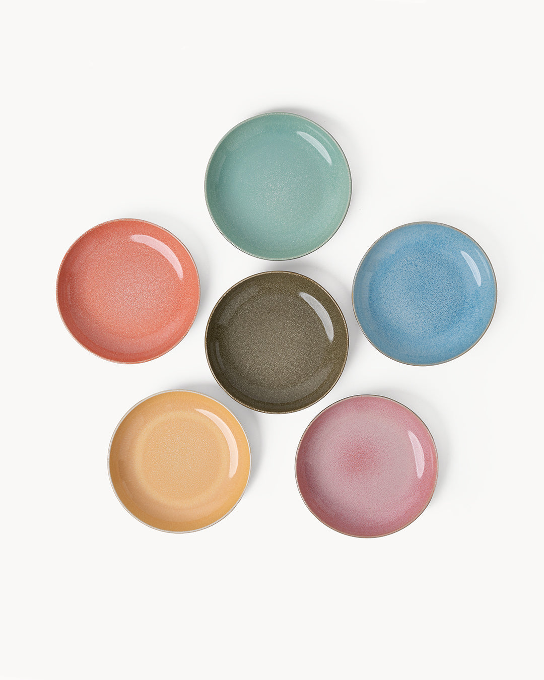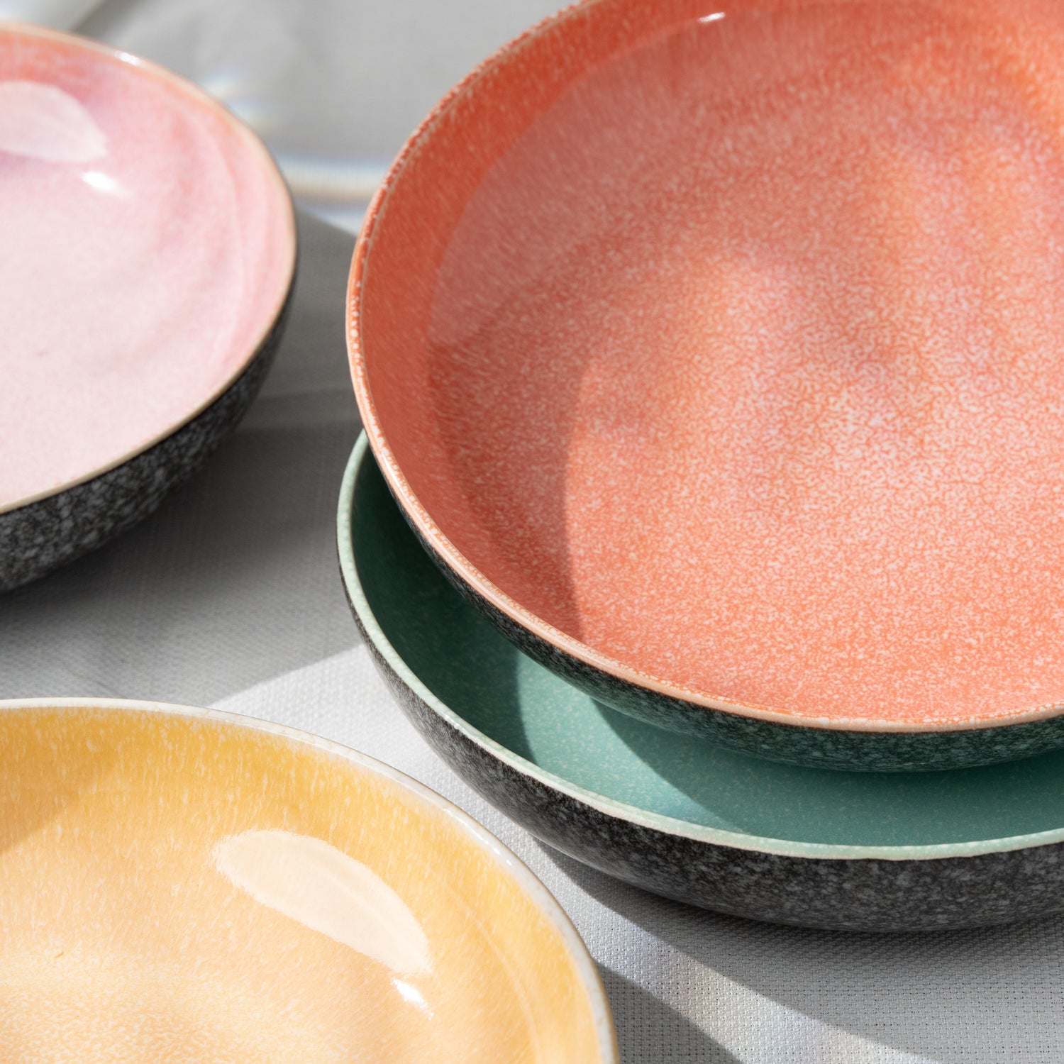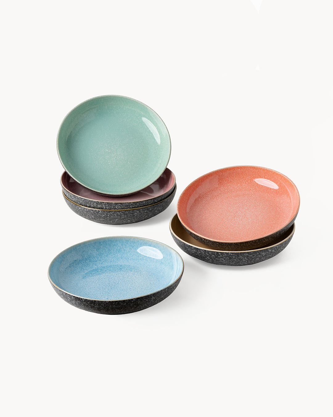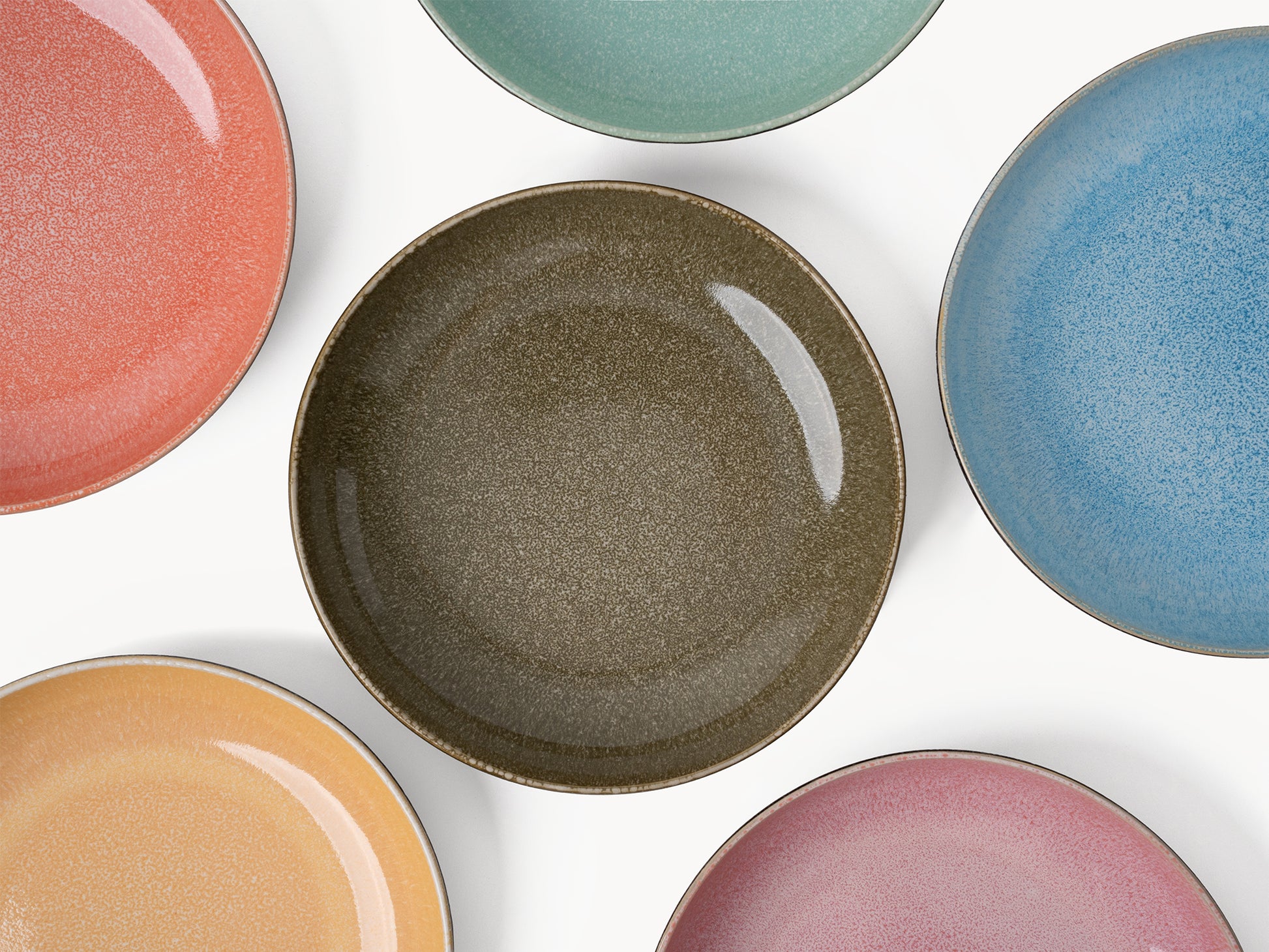 Das 6-teilige Suppenteller-Set der Las Palmitas Kollektion besticht durch sein dunkles, mattes Äußeres und sechs farbenfrohe Glasuren im Inneren. Mit 22 cm Durchmesser und 850 ml Fassungsvermögen eignen sich die Teller perfekt für Suppen, Pasta, Salate oder Müsli. Stapelbar, spülmaschinen- und mikrowellengeeignet, verbinden sie Alltagstauglichkeit mit modernem Design – ideal auch als Geschenk.