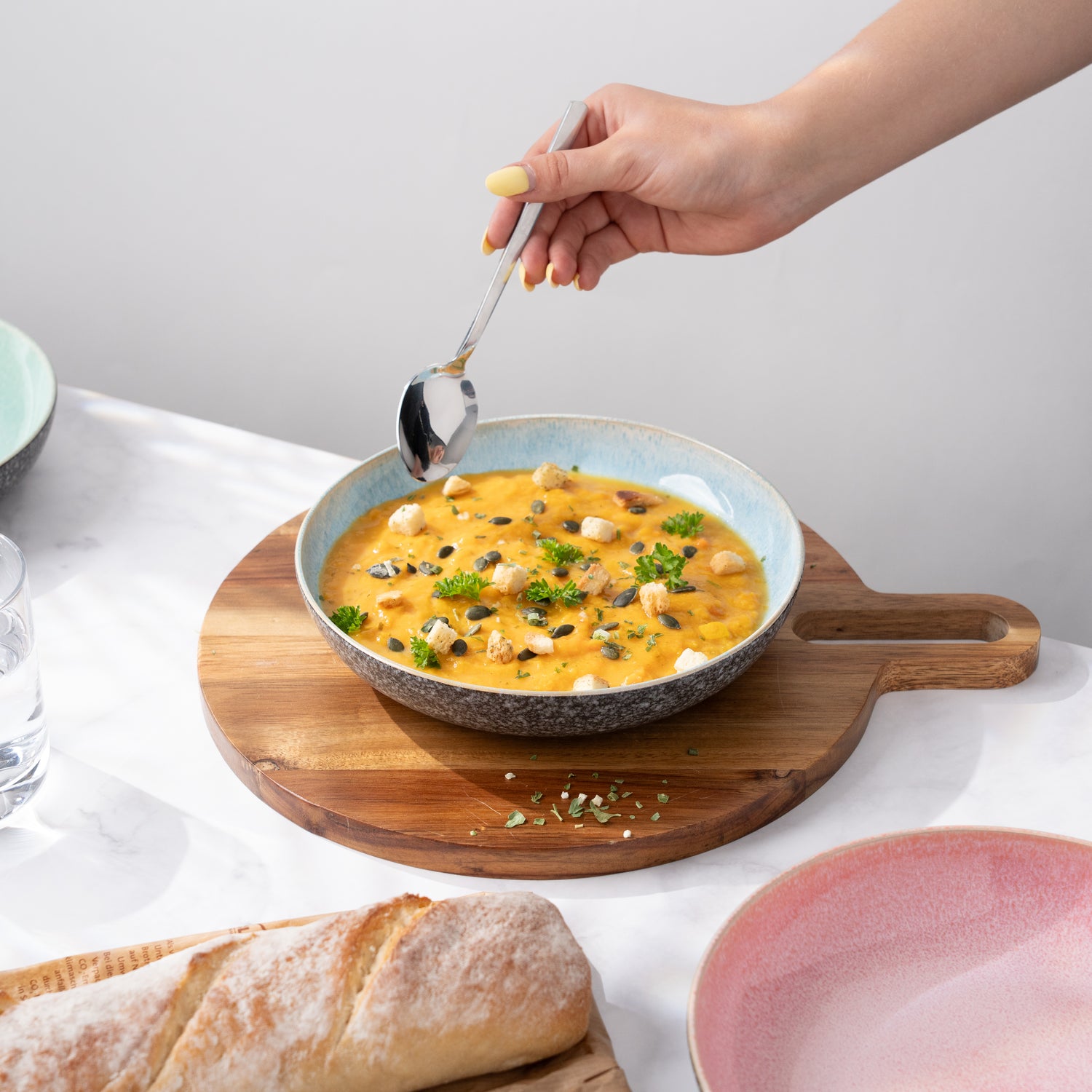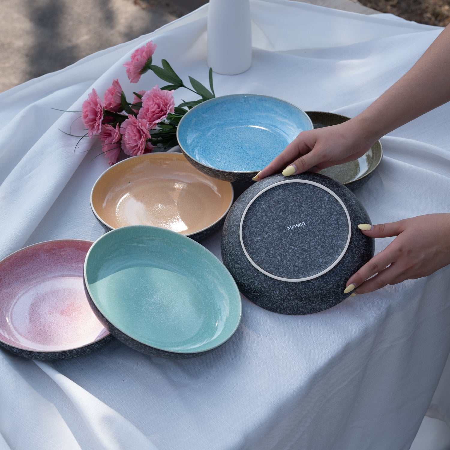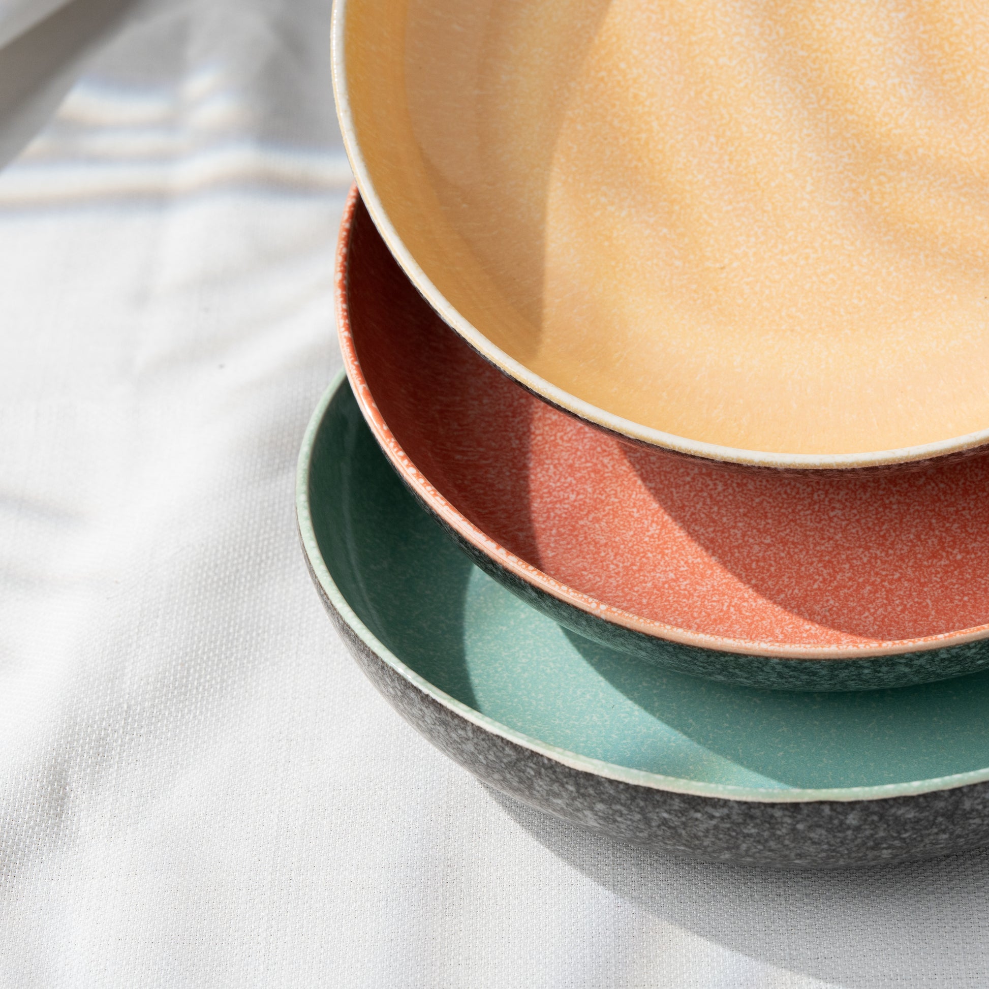 Das Suppenteller-Set der Las Palmitas Kollektion kombiniert das matte, dunkle Außendesign mit sechs lebendigen Farben im Inneren. Mit einem Durchmesser von 22 cm und einem Fassungsvermögen von 850 ml bieten die Teller ausreichend Platz für Suppen, Pasta, Salate oder Müsli. Ihre praktische Stapelfähigkeit sorgt für eine platzsparende Aufbewahrung. Dank der Mikrowellen- und Spülmaschinenfestigkeit sind sie besonders pflegeleicht und ideal für den täglichen Gebrauch.